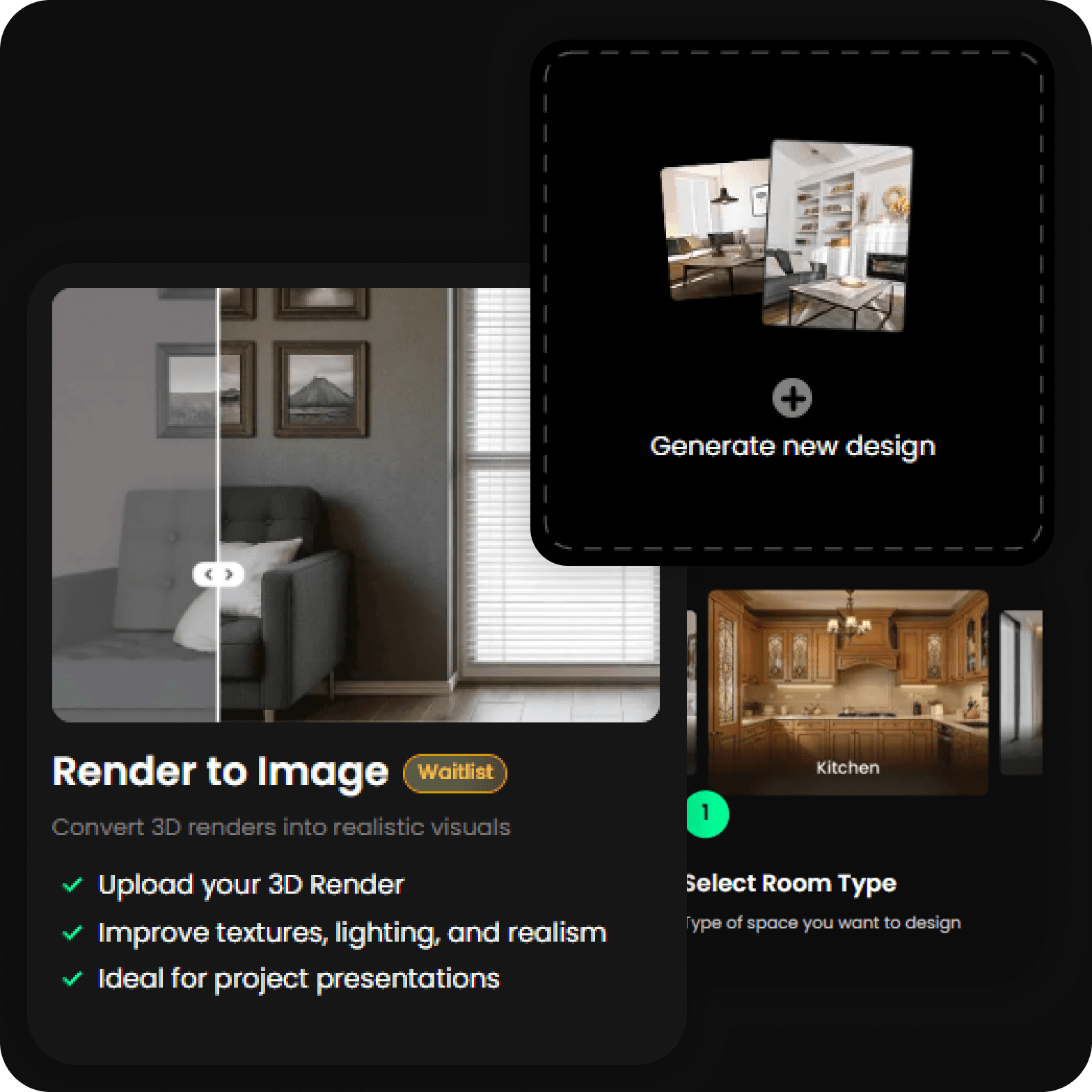Design your perfect space in just 2 minutes with the power of AI. No design skills needed — simply tell us your style, budget, and room type. We’ll generate a stunning, personalized interior that’s ready to bring to life.